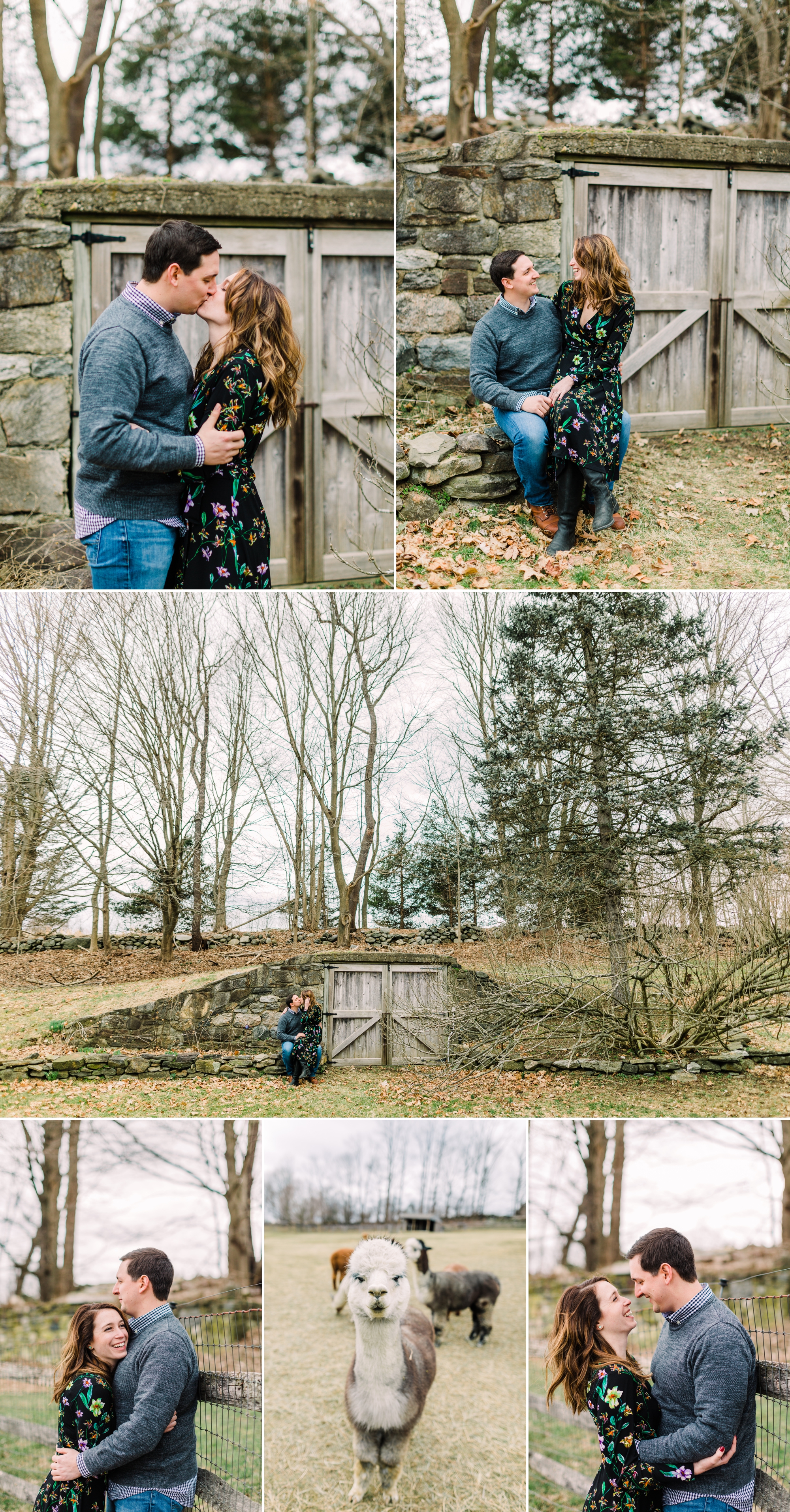 Alpacas are the models I never knew we NEEDED at an engagement session. These alpacas were extremely friendly, cute, and curious to what was going on. This session was full of laughter, cuddling and silly alpaca faces. Leda one of the owners of the farm was telling us the alpacas were the furriest right as we were photographing since they have not been sheared yet. Needless to say we took the opportunity to farm up our cold fingers with the alpacas fur and the super sweet Icelandic horses manes. Despite it going back to feeling like a cold winter afternoon the farm itself was absolutely beautiful. The Hudson Valley area is always so beautiful, no matter what time of year, and I was especially fond over the old root cellar by the house. There is something charming about old stonewalls and structures that make you think of being someplace in Europe.